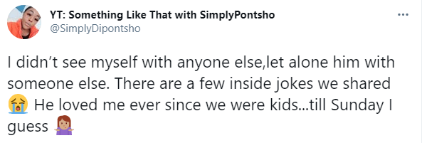 In a series of tweets, the lady identified with the Twitter handle @SimplyDipontsho expressed how heartbroken and devastated she is.