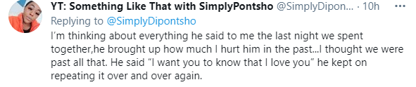 I’m thinking about everything he said to me the last night we spent together,he brought up how much I hurt him in the past…I thought we were past all that. He said “I want you to know that I love you” he kept on repeating it over and over again.