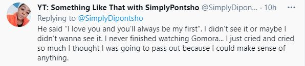 He said “I love you and you’ll always be my first”. I didn’t see it or maybe I didn’t wanna see it. I never finished watching Gomora… I just cried and cried so much I thought I was going to pass out because I could not make sense of anything.”