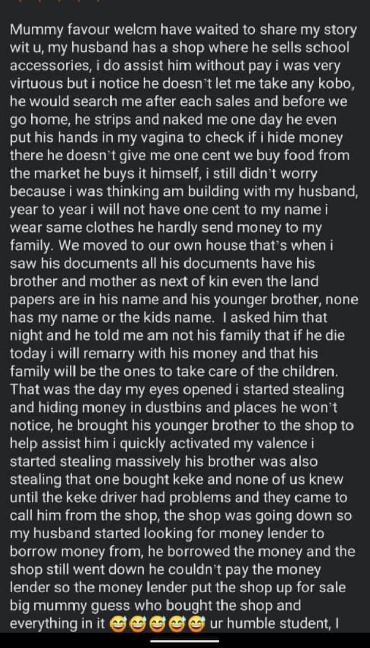 “Mummy favour welcm have waited to share my story wit u, my husband has a shop where he sells school accessories, i do assist him without pay i was very virtuous but i notice he doesn’t let me take any kobo, he would search me after each sales and before we go home, he strips and naked me one day he even put his hands in my vagina to check if i hide money there he doesn’t give me one cent we buy food from the market he buys it himself, i still didn’t worry because i was thinking am building with my husband, year to year i will not have one cent to my name i wear same clothes he hardly send money to my family. We moved to our own house that’s when i saw his documents all his documents have his brother and mother as next of kin even the land papers are in his name and his younger brother, none has my name or the kids name. I asked him that night and he told me am not his family that if he die today i will remarry with his money and that his family will be the ones to take care of the children. That was the day my eyes opened i started stealing and hiding money in dustbins and places he won’t notice, he brought his younger brother to the shop to help assist him i quickly activated my violence i started stealing massively his brother was also stealing that one bought keke and none of us knew until the keke driver had problems and they came to call him from the shop, the shop was going down so my husband started looking for money lender to borrow money from, he borrowed the money and the shop still went down he couldn’t pay the money lender so the money lender put the shop up for sale big mummy guess who bought the shop and everything in it ur humble student, I”