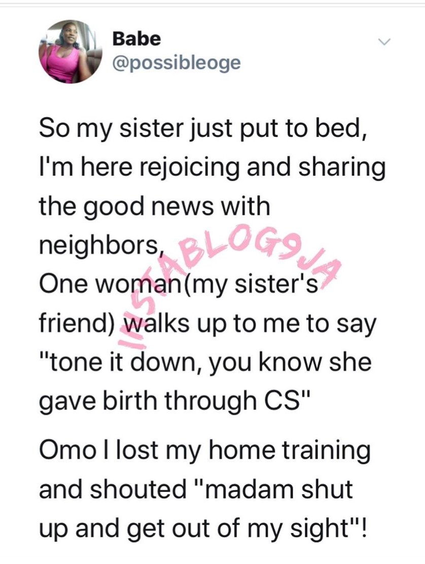 A young lady identified as Oge, has taken to Twitter to reveal how a neighbor asked her to stop celebrating her sister’s delivery because she delivered through operation.
