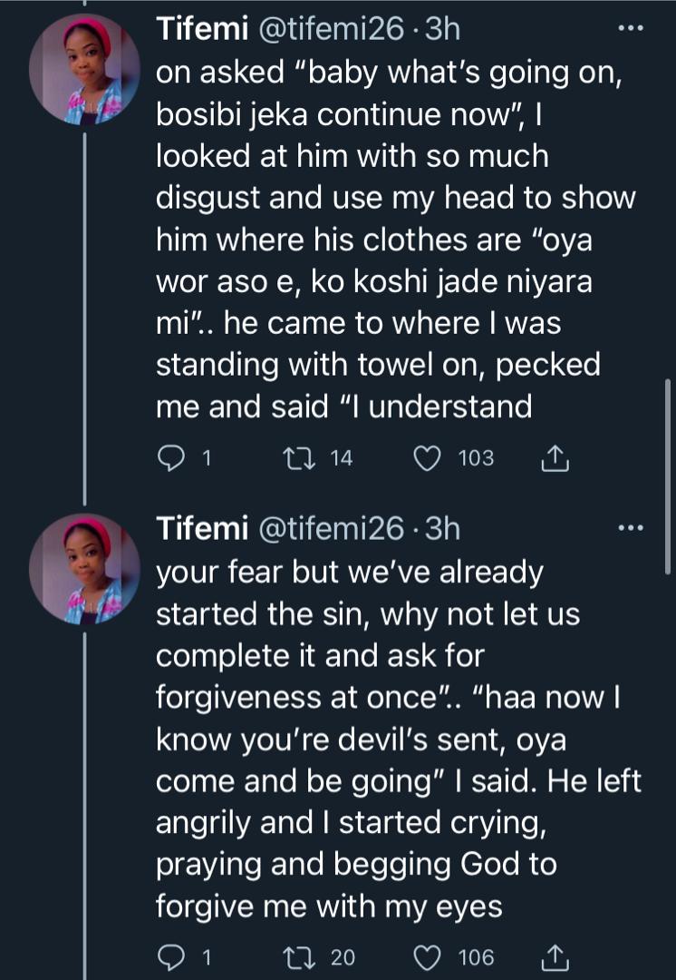 “I remembered one time I was committing sin on the bed with this guy and while at it, I made an eye contact with my Bible (cause it’s always on my bed) and I quickly turned my eyes away in fear like “Jesu mabinu oh, I’ll explain to you when I’m done Weary face”.. and I use my second hand to push the Bible down cause the other hand was holding one of my legs Expressionless face.. tatatatata and all of a sudden I started having guilty conscience like “Tife you pushed down your God cause of knacks” “Tife oya mu Bible yen nile” “Just imagine if you take your …”