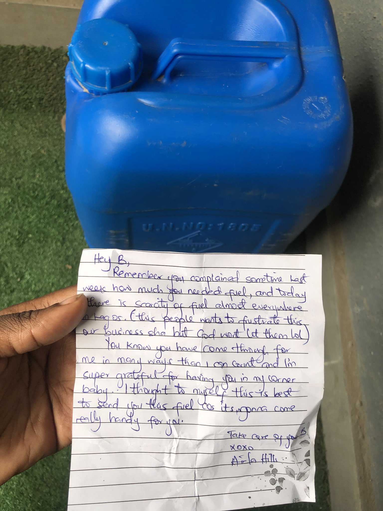 She revealed on her Twitter account @Mhisoby that she arrived home in the morning to find a gallon of gasoline waiting for her, generosity of a considerate friend.