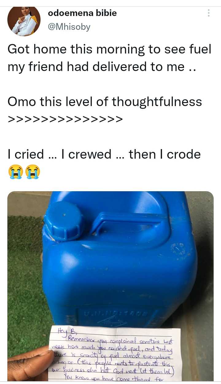 Odoemena Bibie, a young woman, has disclosed to netizens how a friend moved her to sobs by gifting her a gallon of fuel during the nation’s petrol scarcity problem.