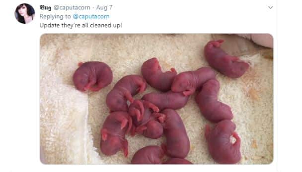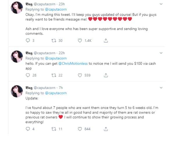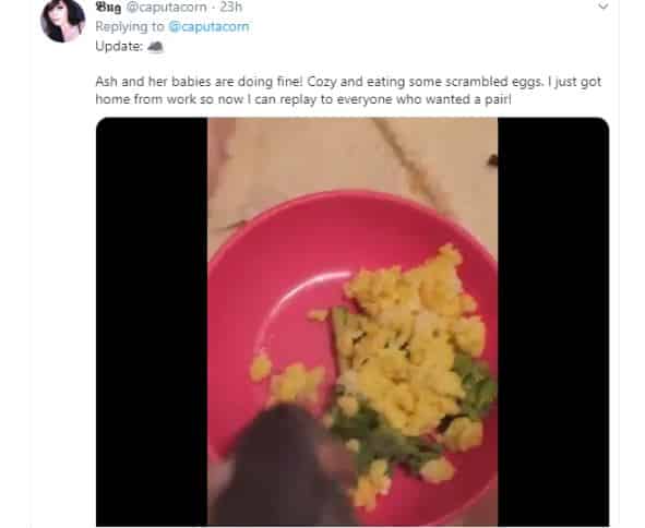 Sharing a photo of the scrambled egg she made for her rat named ‘Ash’ and her pups, the American lady revealed that they are doing fine. @caputacorn also disclosed that she found people who want to take the pups when they are 5-6 weeks old.