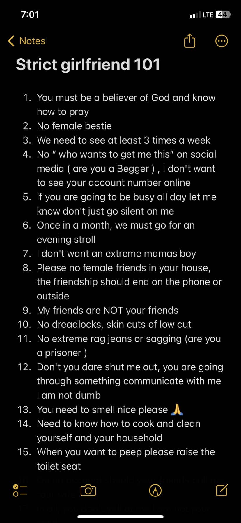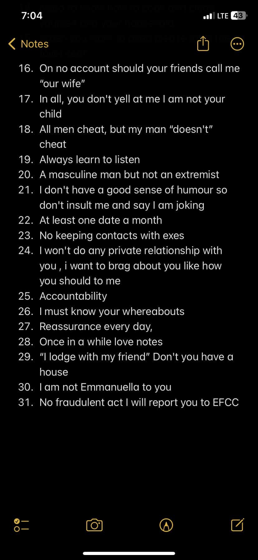 Lady reveals 31 strict relationship rules for future boyfriend