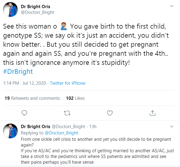 “See this woman o You gave birth to the first child, genotype SS; we say ok it’s just an accident, you didn’t know better. . But you still decided to get pregnant again and again SS, and you’re pregnant with the 4th.. this isn’t ignorance anymore it’s stupidity!