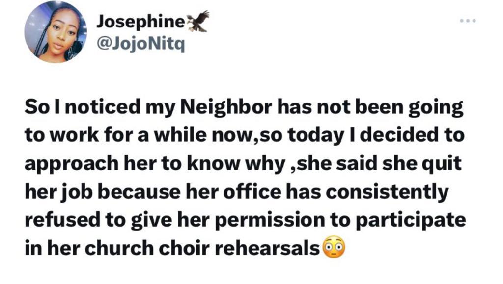 “So I noticed my Neighbor has not been going to work for a while now,so today I decided to approach her to know why ,she said she quit her job because her office has consistently refused to give her permission to participate in her church choir rehearsals”