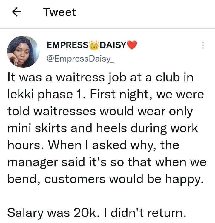 A Twitter user identified as @EmpressDaisy_ has narrated how she quit a job as a waitress at a club in Lekki Phase 1 after she was asked to wear mini skirt and heels.