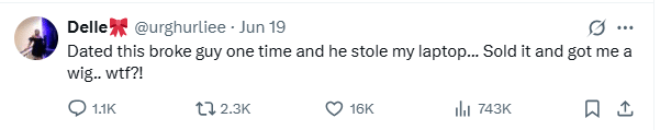 “Dated this broke guy one time and he stole my laptop… Sold it and got me a wig.. wtf?!”