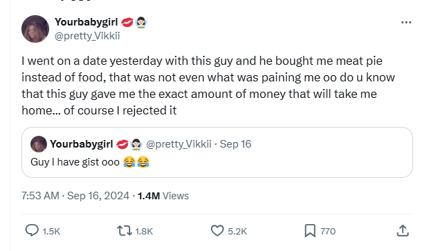 “I went on a date yesterday with this guy and he bought me meat pie instead of food, that was not even what was paining me oo do u know that this guy gave me the exact amount of money that will take me home… of course I rejected it”