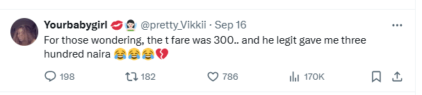 “For those wondering, the t fare was 300.. and he legit gave me three hundred naira 😂😂😂💔”