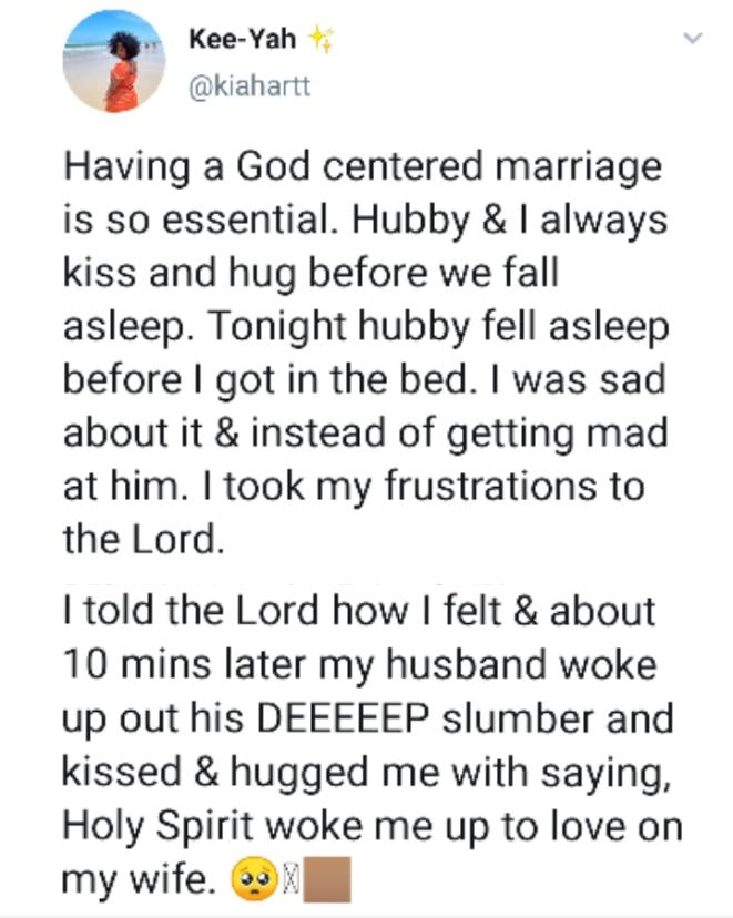 The lady identified as @kiahartt on Twitter revealed that her husband usually kisses and hugs her before they sleep every night.