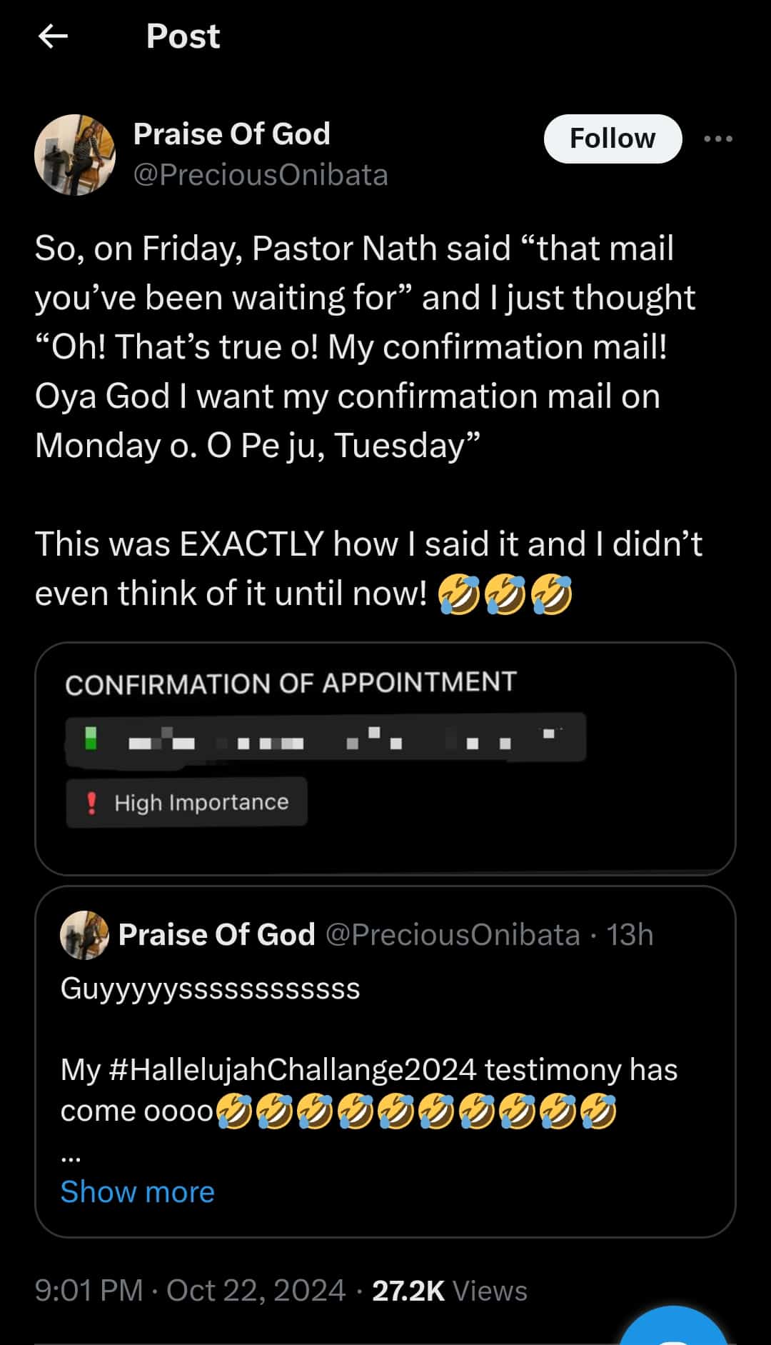 A Nigerian lady has shared her testimony of receiving an appointment letter just days after a pastor, during the Hallelujah Challenge, prophesied that those awaiting confirmation emails would receive them soon.