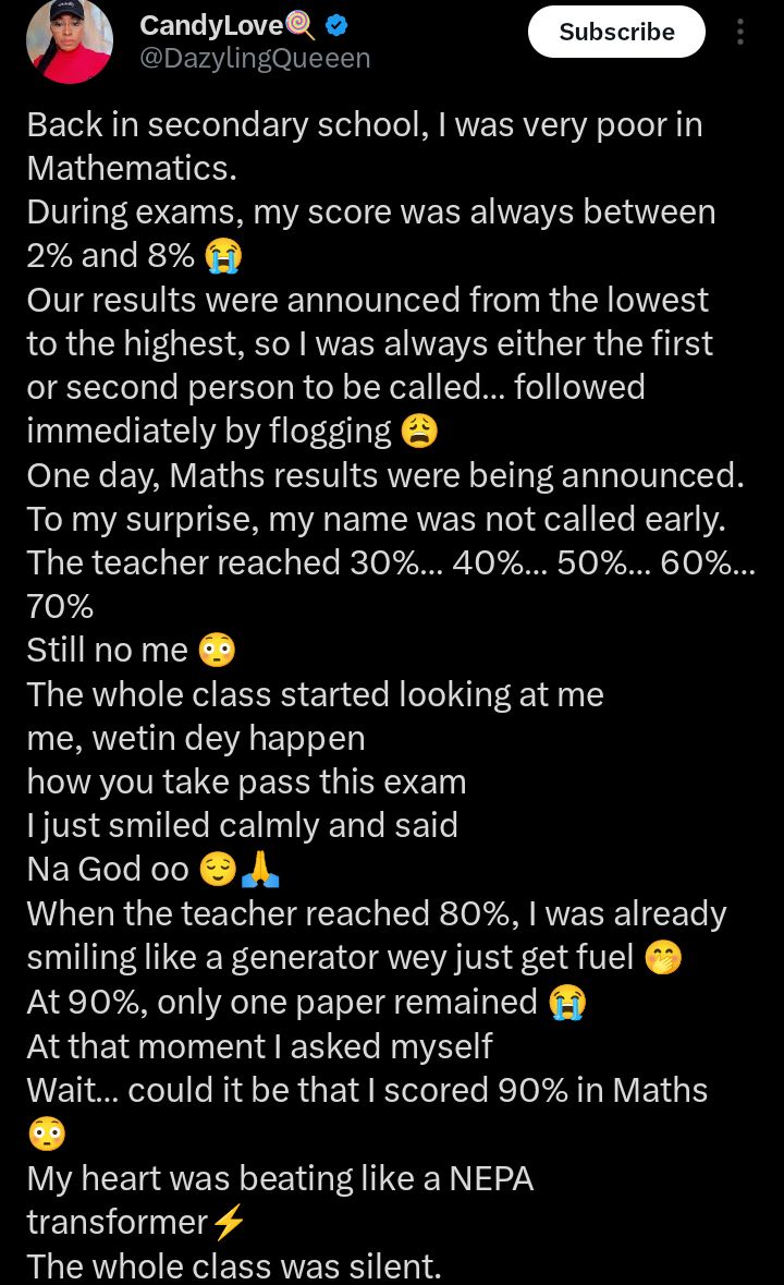 Lady recount how she fainted after thinking she scored 90% in maths, discovers she got zero