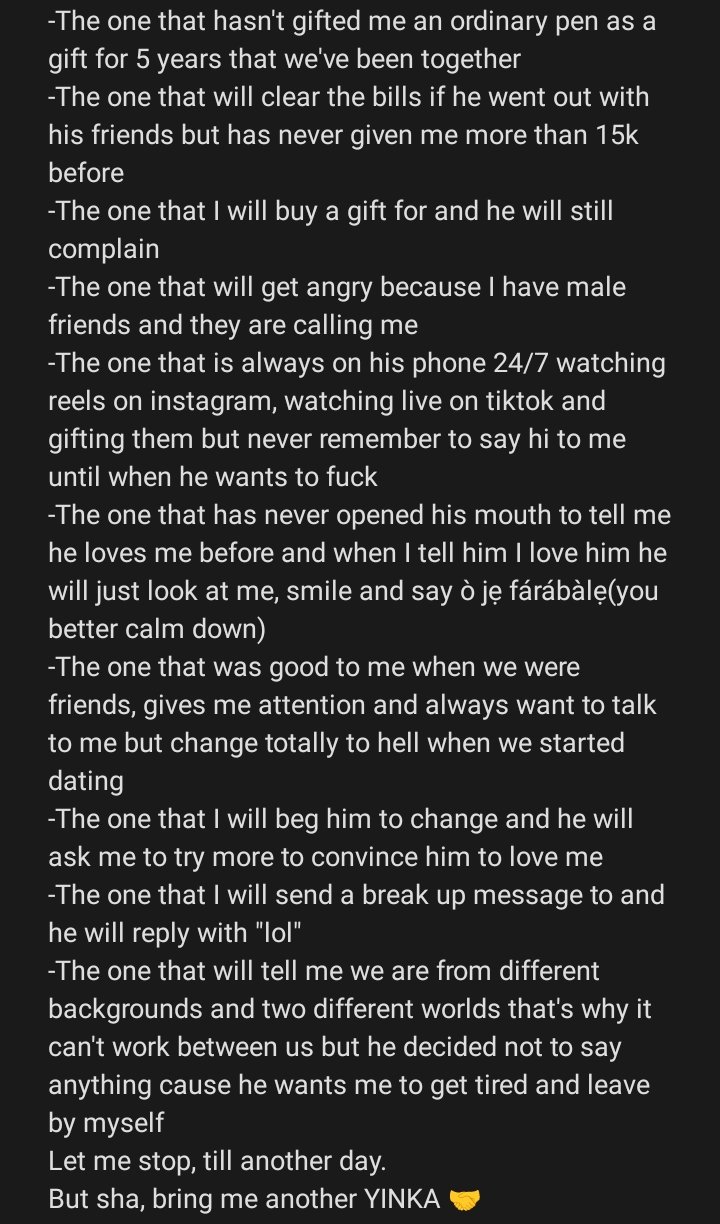 Lady recounts 19 devastating experiences in her relationship with ex-boyfriend, Yinka from Abeokuta