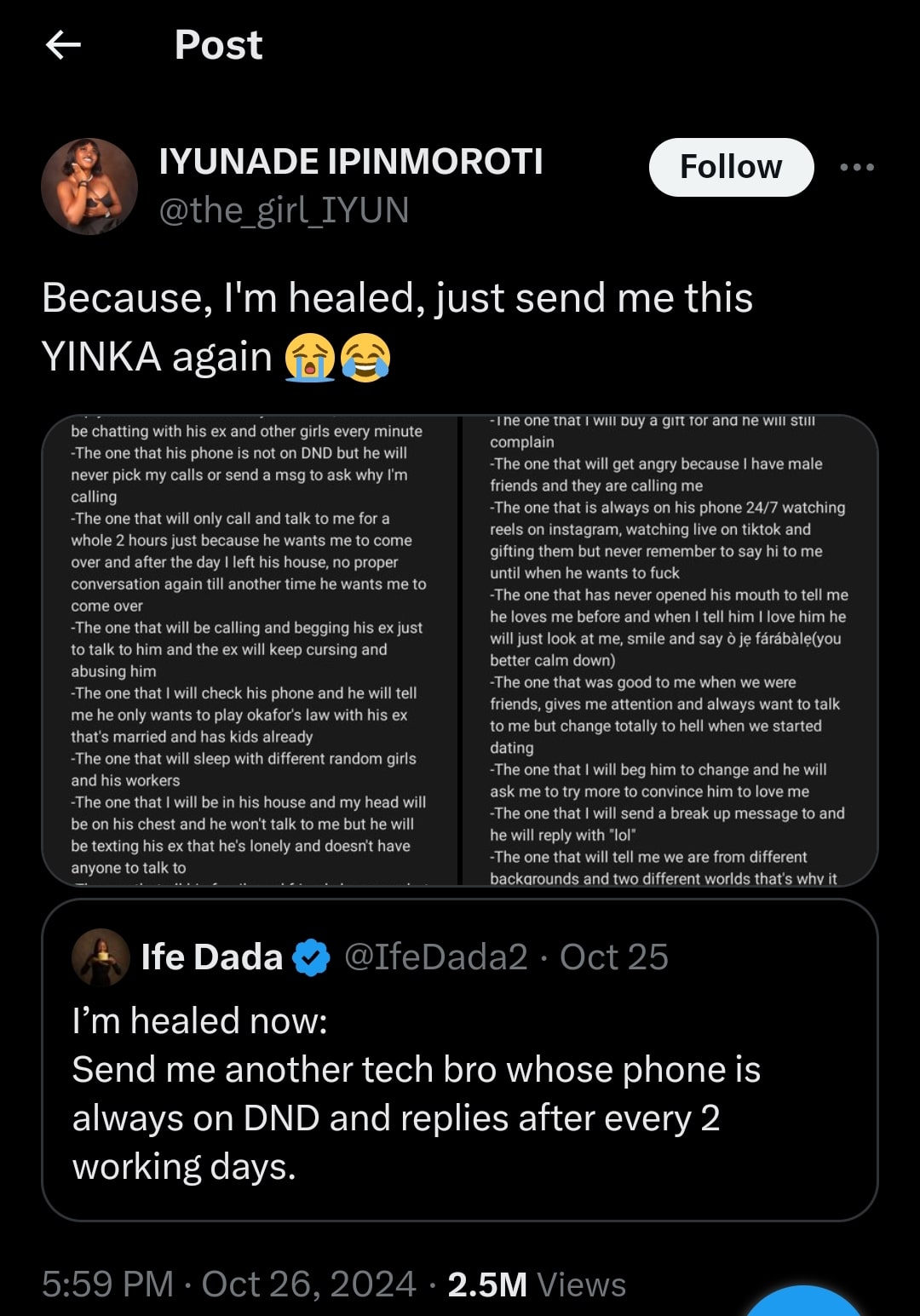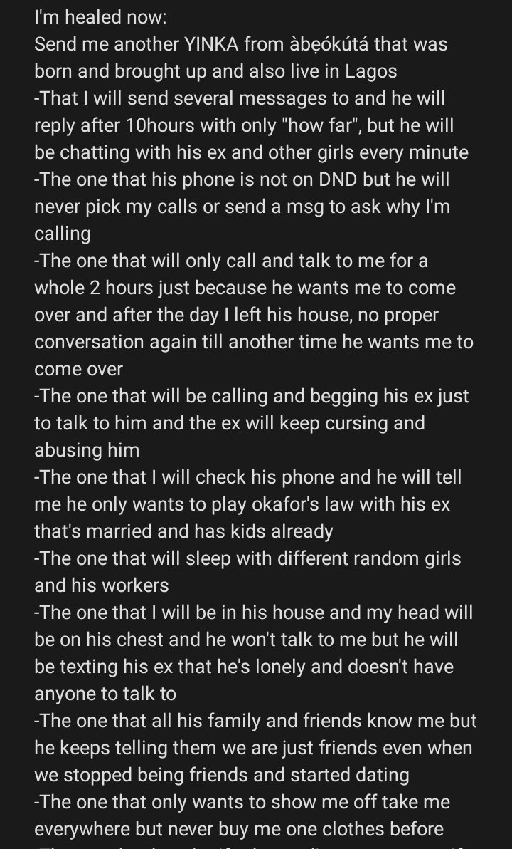 “I’m healed now. Send me another YINKA from Abeokuta who was born, raised, and now lives in Lagos.”