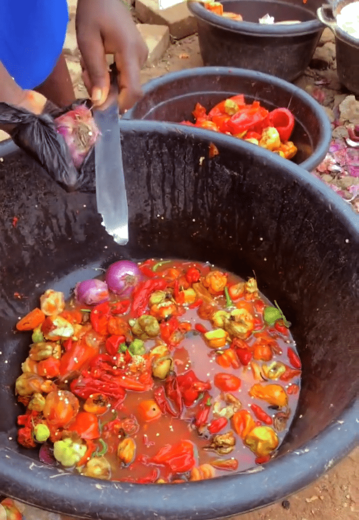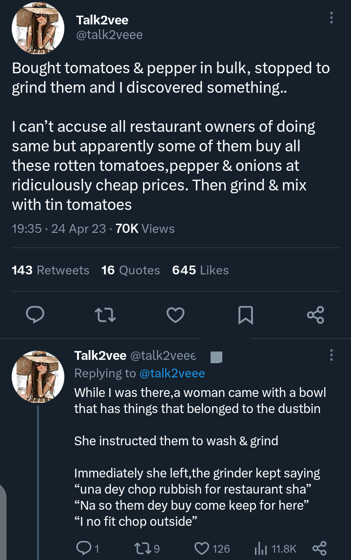 “Bought tomatoes & pepper in bulk, stopped to grind them and I discovered something. I can’t accuse all restaurant owners of doing same but apparently some of them buy all these rotten tomatoes,pepper & onions at ridiculously cheap prices. Then grind & mix with tin tomatoes
