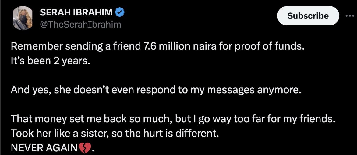 It’s been 2 years. And yes, she doesn’t even respond to my messages anymore. That money set me back so much, but I go way too far for my friends. Took her like a sister, so the hurt is different. NEVER AGAIN💔,” she wrote.