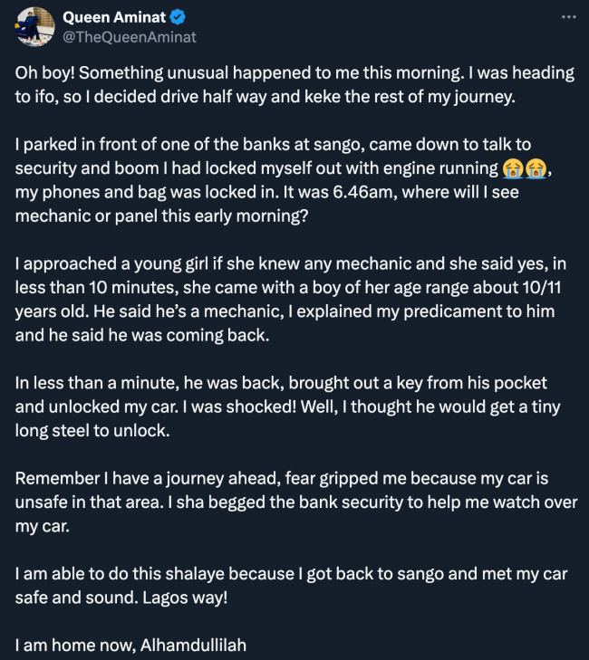Identified as @TheQueenAminat on X (formerly Twitter), she narrated a mishap while on a journey that also left her stranded.