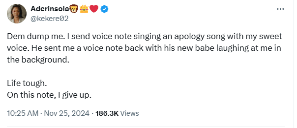 “Dem dump me. I send voice note singing an apology song with my sweet voice. He sent me a voice note back with his new babe laughing at me in the background.