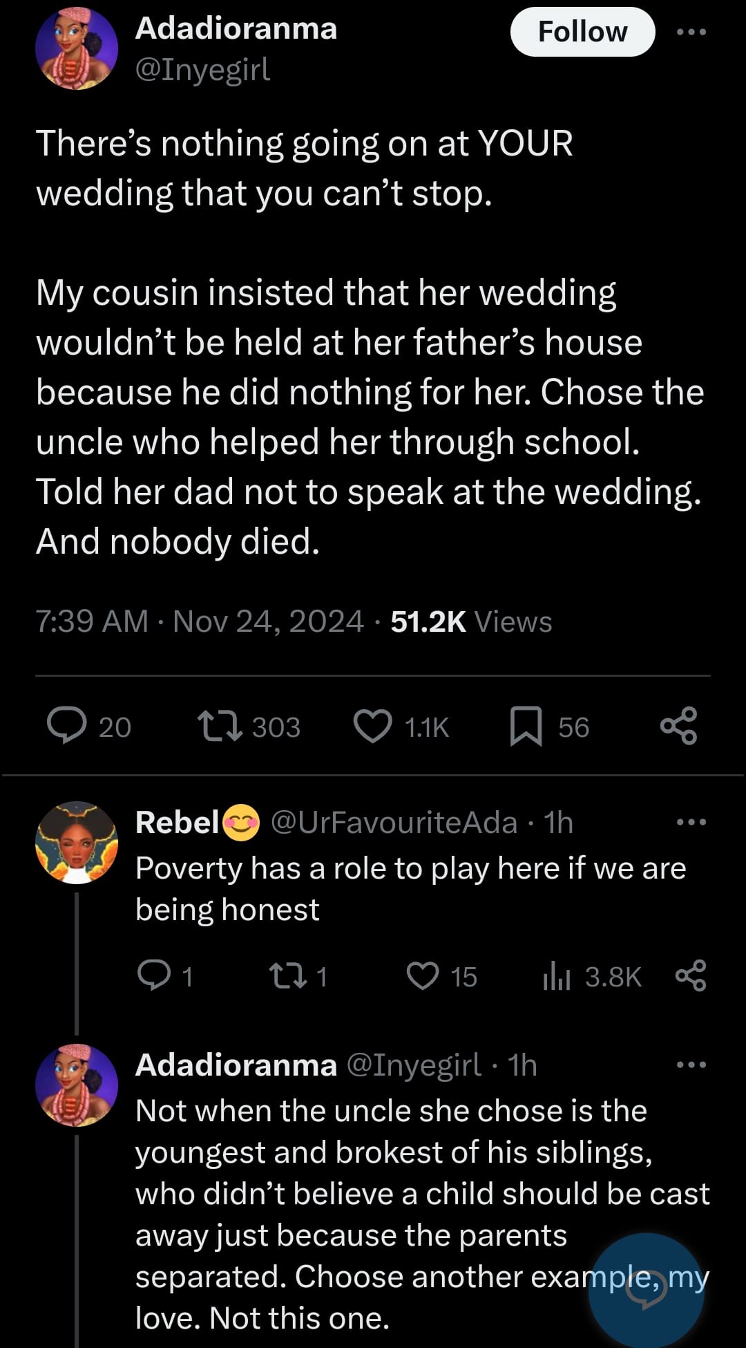 Her statement read: “There’s nothing going on at YOUR wedding that you can’t stop. My cousin insisted that her wedding wouldn’t be held at her father’s house because he did nothing for her. She chose the uncle who helped her through school. Told her dad not to speak at the wedding. And nobody died.”