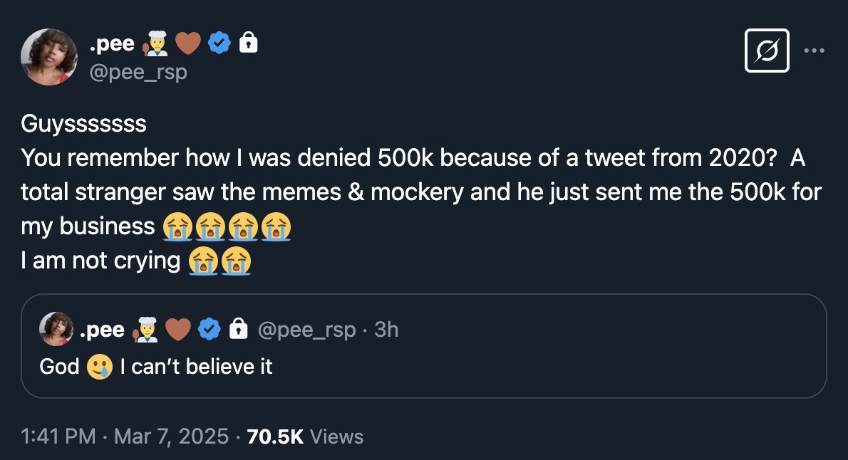 “God 🥲 I can’t believe it. Guysssssss You remember how I was denied 500k because of a tweet from 2020? A total stranger saw the memes & mockery and he just sent me the 500k for my business 😭😭😭😭 I am not crying 😭😭.”