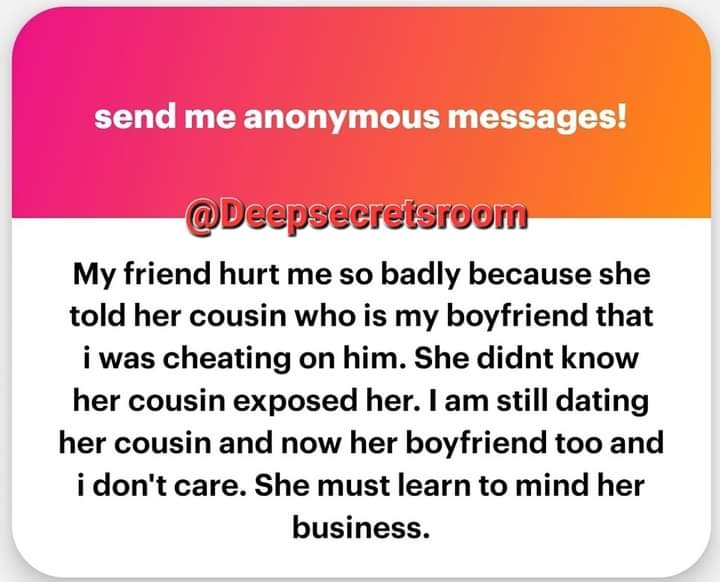 “My friend hurt me so badly because she told her cousin who is my boyfriend that i was cheating on him. She didnt know her cousin exposed her. I am still dating her cousin and now her boyfriend too and i don’t care. She must learn to mind her business.”