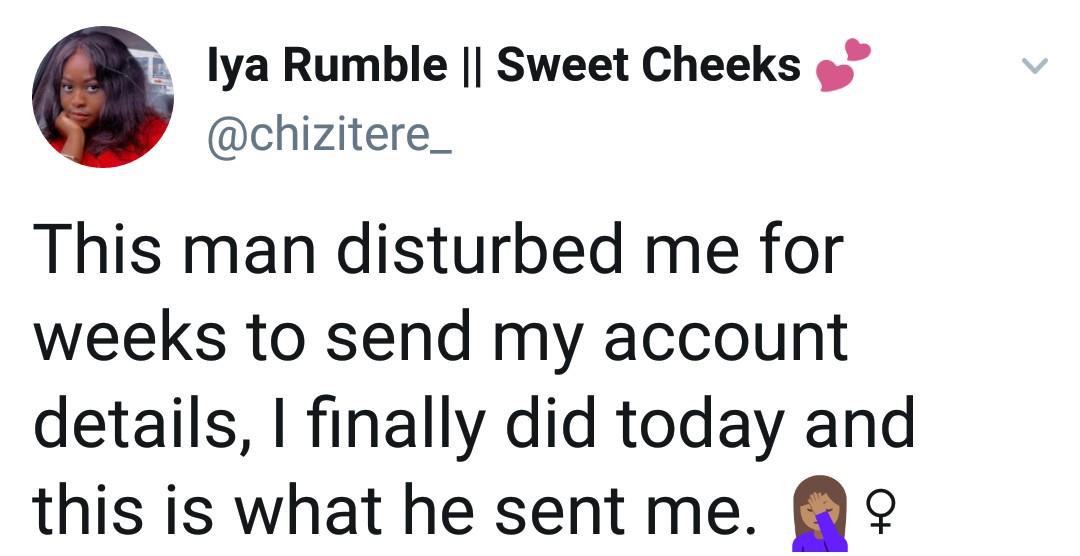 Twitter user, Chizitere has shared her experience with a random man who disturbed her for a long time to send her account details.