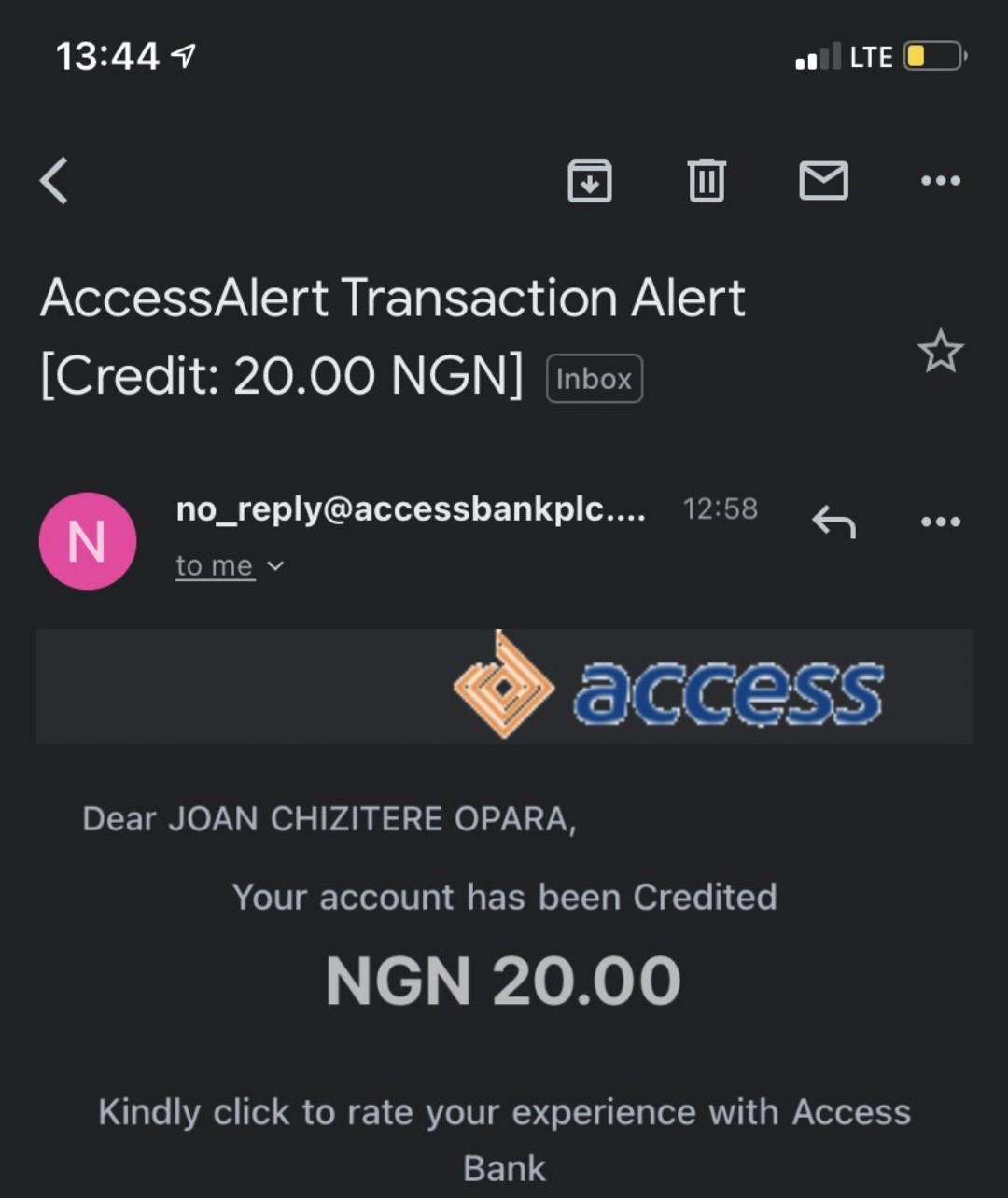 She finally sent her account details to him, and surprisingly, she saw a credit alert of N20 from him.