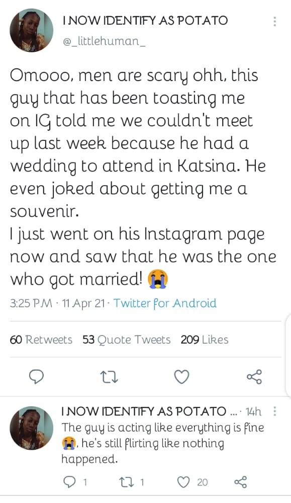 A lady took to Twitter to narrate a situation she described as scary as a soon-to-be-married man kept on toasting her on Instagram despite getting married on the day they were supposed to meet.