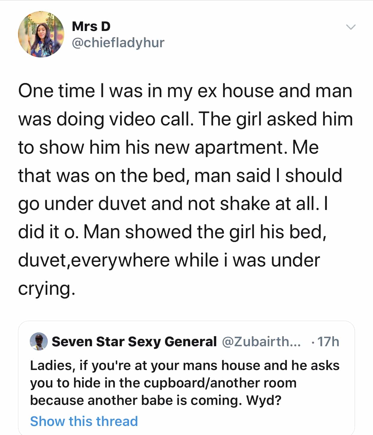 “One time I was in my ex house and man was doing video call. The girl asked him to show him his new apartment. Me that was on the bed, man said I should go under duvet and not shake at all. I did it o. Man showed the girl his bed, duvet,everywhere while i was under crying.