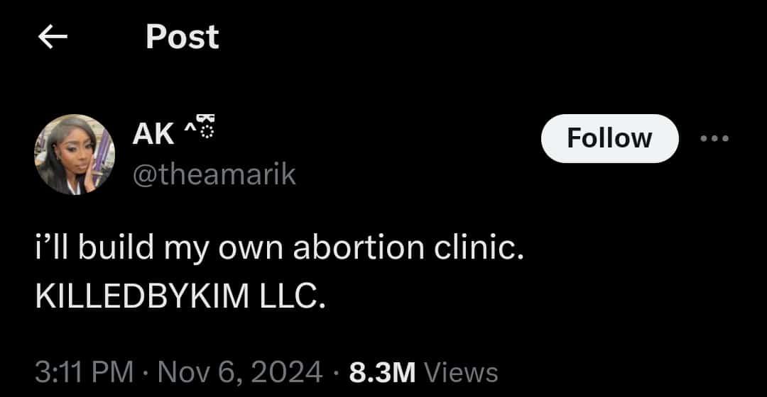 In a post shared on X (formerly Twitter), the lady disclosed her plan, writing, “I’ll build my own abortion clinic. KILLEDBYKIM LLC.”