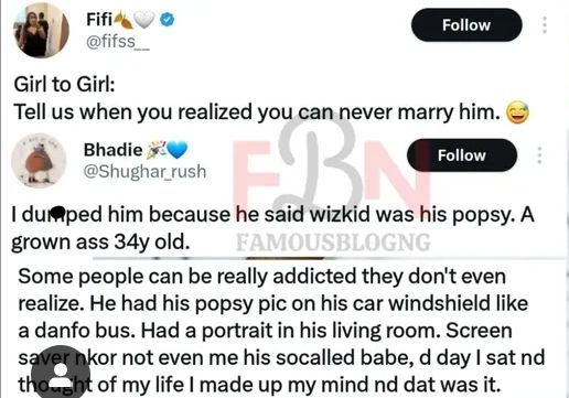 Her tweet reads, “I dumped him because he said Wizkid is his popsy.A grown up ass 34y old. Some people can really be addicted. They don’t even realize. He had his popsy pics on his car windshield like a danfo bus. Had a portrait in his living room. Screen saver nko not even me his so called babe. The day I sat down and think about my life, I made up my mind”.