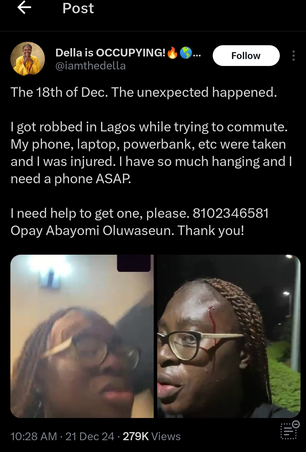 Her statement read: “On December 18th, the unexpected happened. I was robbed in Lagos while trying to commute. My phone, laptop, power bank, and more were taken, and I was injured. I have so much pending, and I urgently need a phone.”