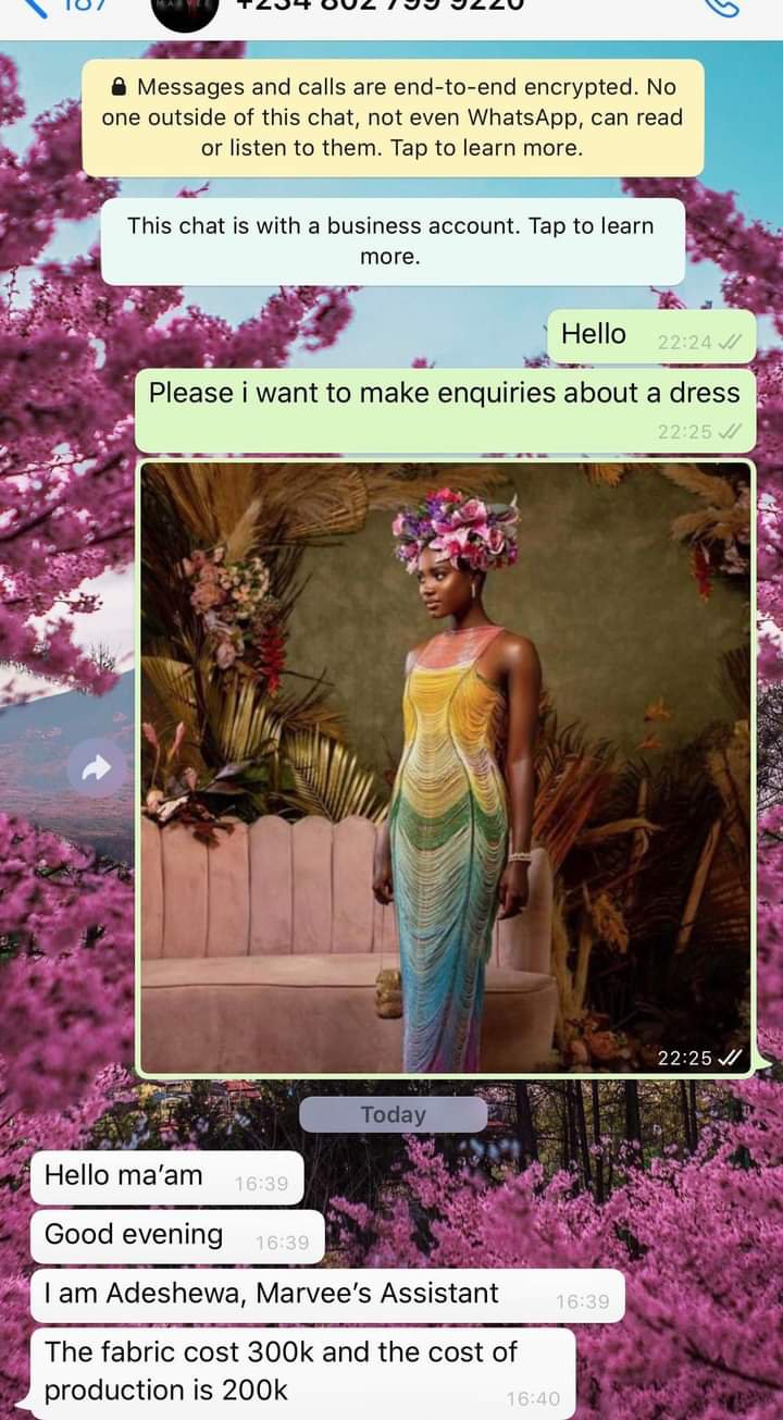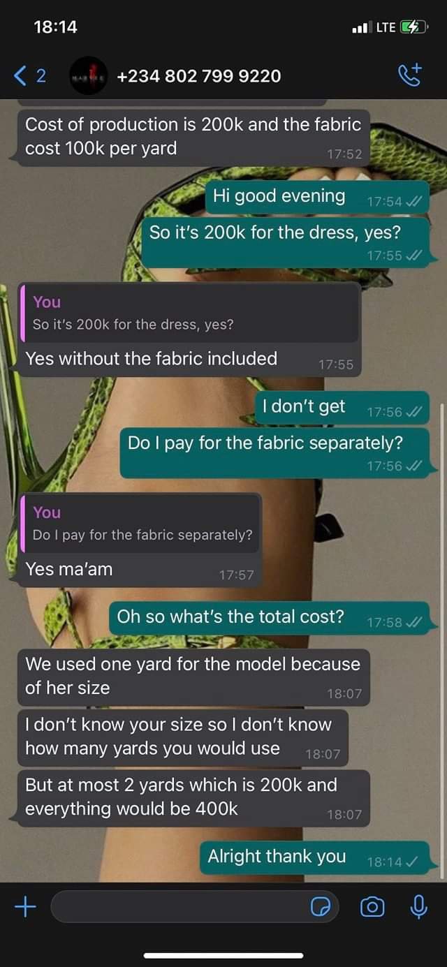 @TheNicoleken had taken to the fashion brand’s WhatsApp DM to make an enquiry about a dress she saw on the brand’s page and was told the fabrics go for N100k per yard while cost of production alone is N200k.