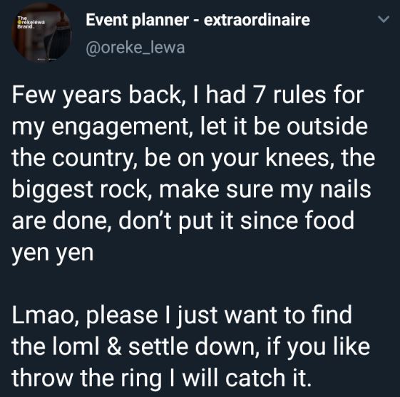 “Few years back, I had 7 rules for my engagement, Let it be outside the country, be on your knees, the biggest rock, make sure my nails are done, don’t put it since food yen yen.