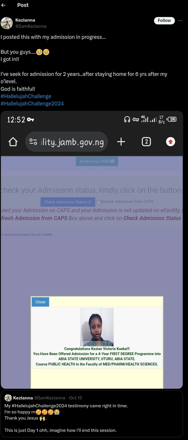 In her post, she mentioned how she participated in the Hallelujah Challenge to pray for admission success.