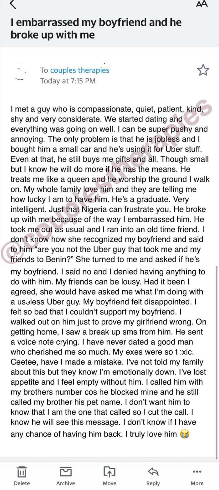 Lady seeks advice after getting dumped for denying boyfriend in front of friend who recognized him as Uber driver