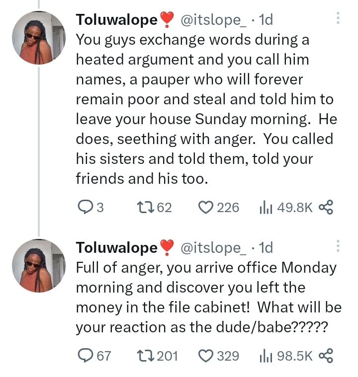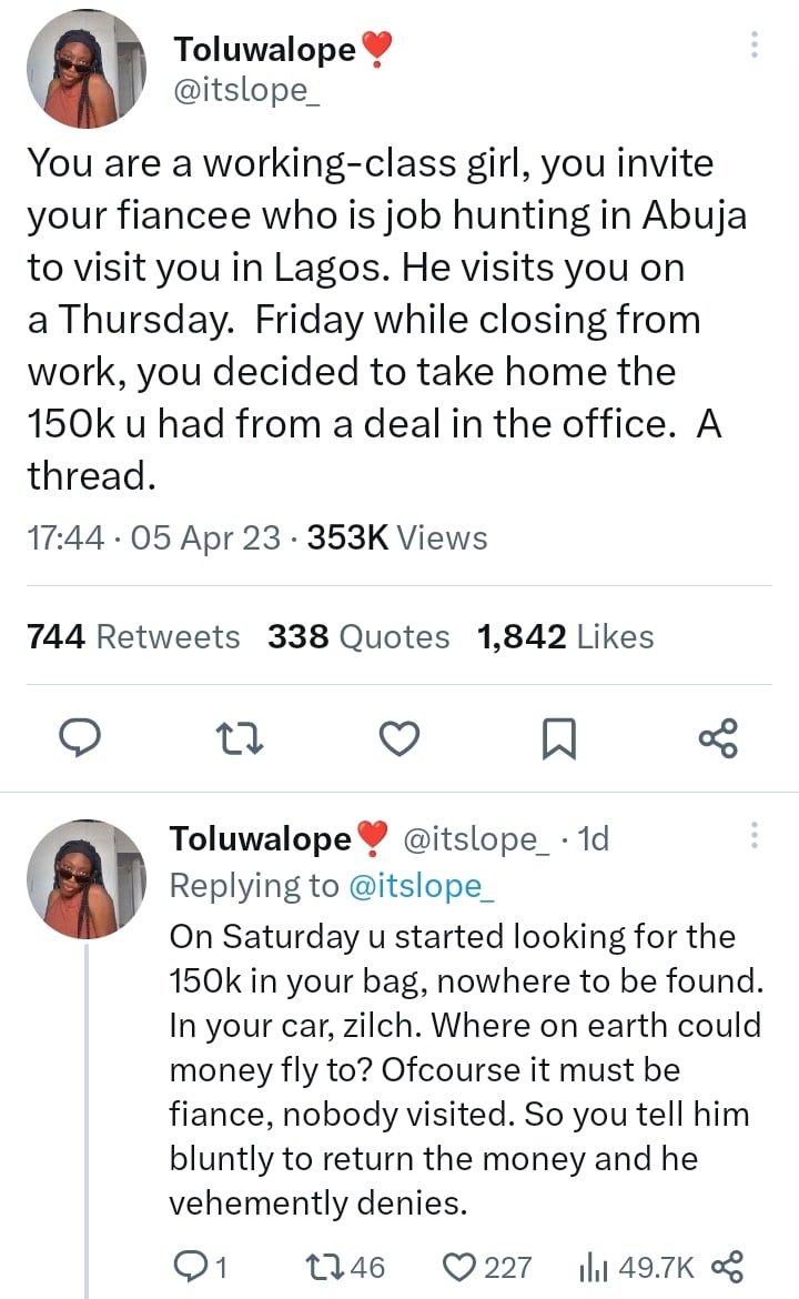 “How a friend ruined her relationship. You are a working-class girl, you invite your fiancée who is job hunting in Abuja to visit you in Lagos. He visits you on a Thursday. Friday while closing from work, you decided to take home the 150k u had from a deal in the office.