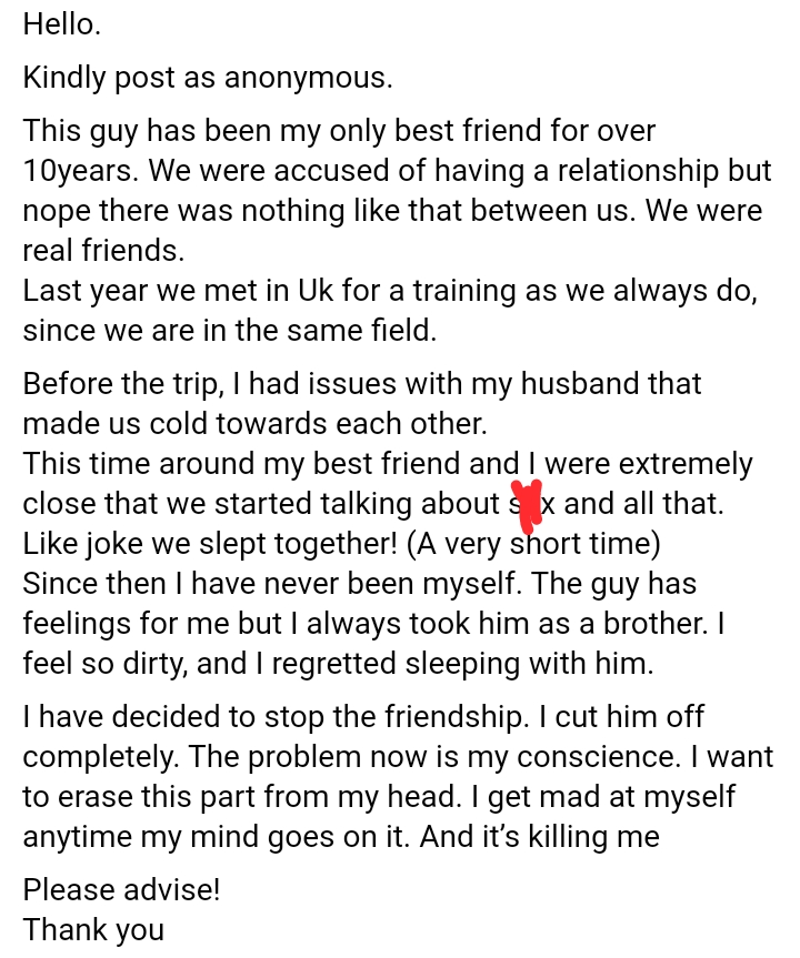 The lady and the male best friend usually attend a training in UK and after a quarrel with her husband, she slept with the male friend and now she can’t seem to forgive herself and get the image out of her head.
