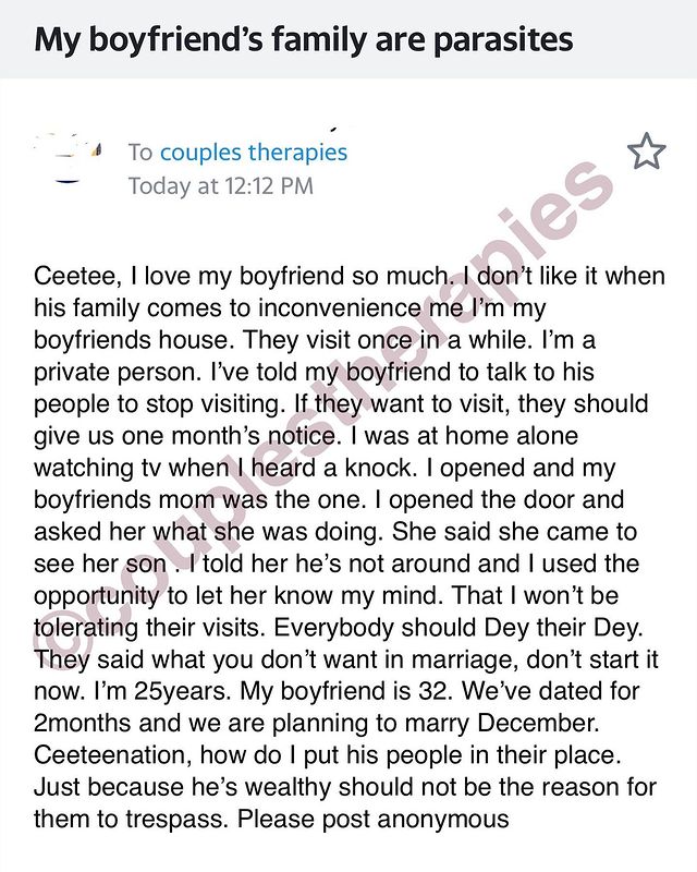 That I won’t be tolerating their visits. Everybody should Dey their Dey. They said what you don’t want in marriage, don’t start it now. I’m 25years. My boyfriend is 32.