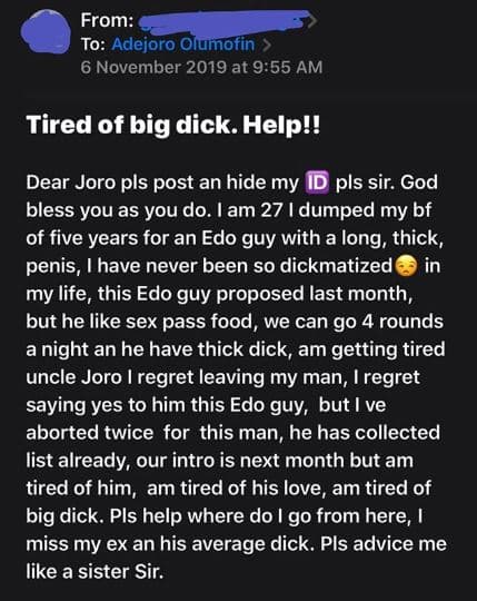 Relationship blogger and adviser, Joro Olumofin has shared the story of a lady battling with the issue of a massive manhood.