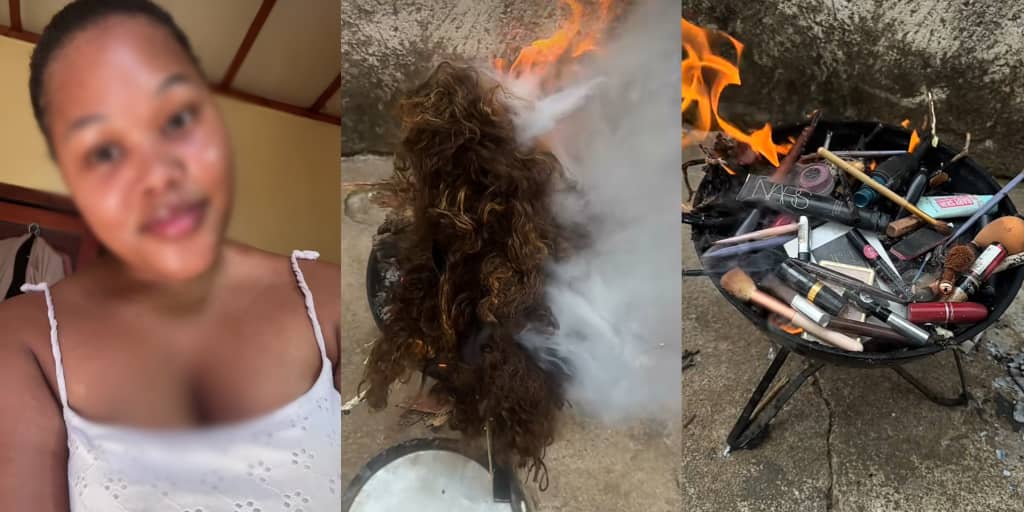 A lady has sparked reactions online after setting fire to her makeup kits, wigs, and eyelashes, declaring she has given her life to Christ and chosen to embrace God’s natural beauty.