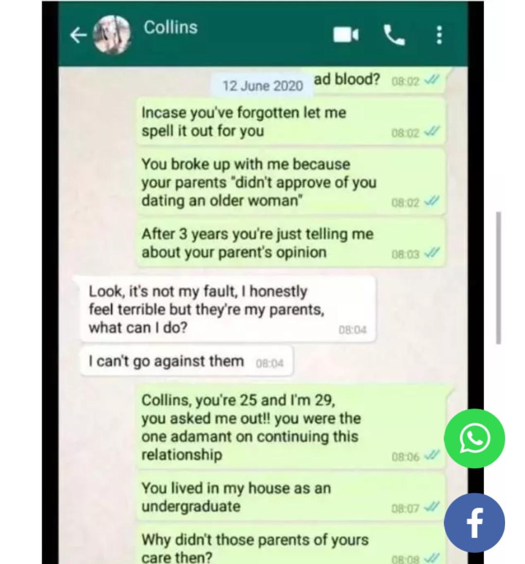 Lady shares chat with boyfriend who broke up with her after she trained him in school and fed him, says she’s too old for him