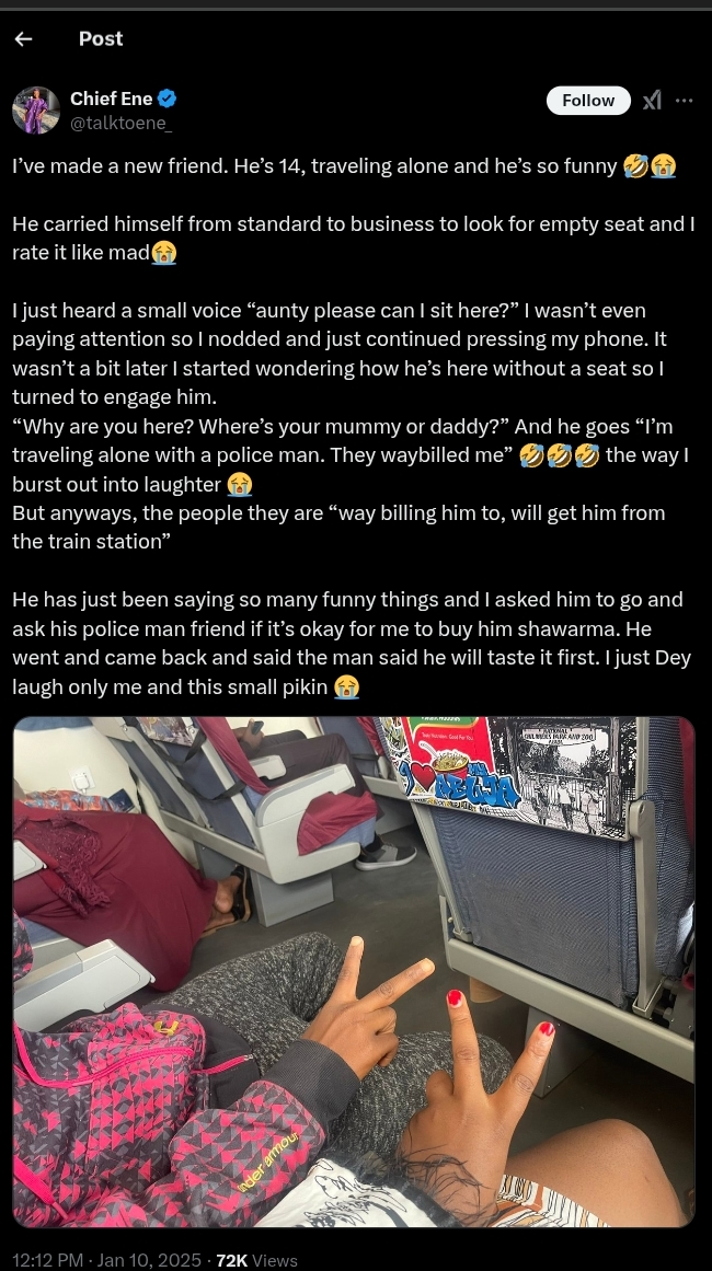 She recounted: “I’ve made a new friend. He’s 14, traveling alone, and he’s so funny 🤣😭. He carried himself from standard to business class to look for an empty seat, and I rate it like mad😭.”