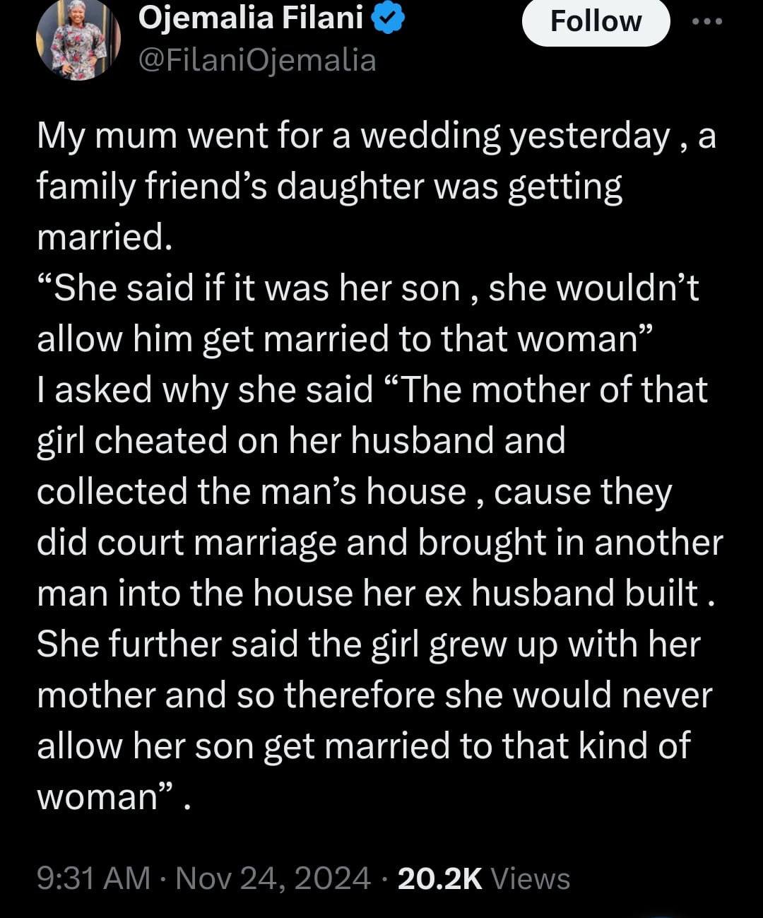 “I asked why she said ‘The mother of that girl cheated on her husband and collected the man’s house , cause they did court marriage and brought in another man into the house her ex husband built . She further said the girl grew up with her mother and so therefore she would never allow her son get married to that kind of woman.”