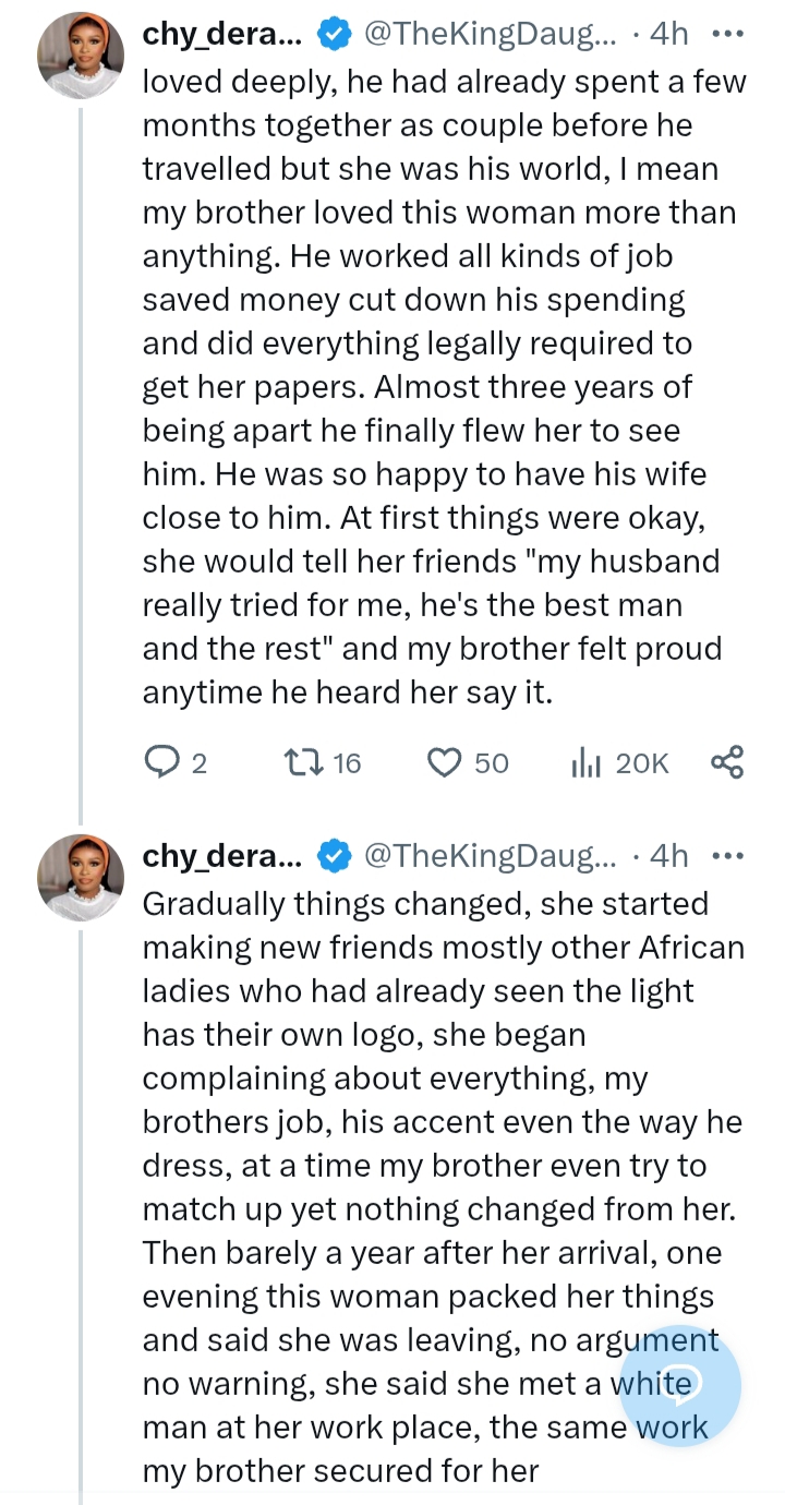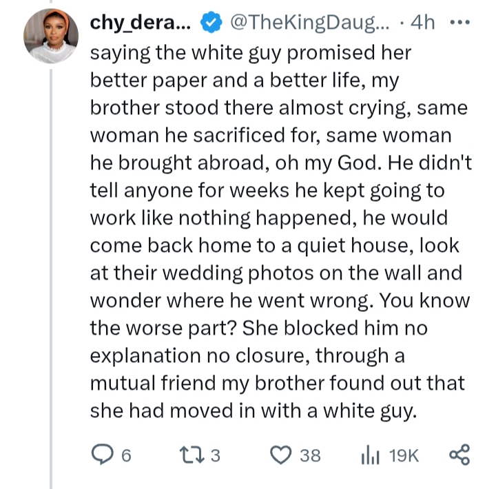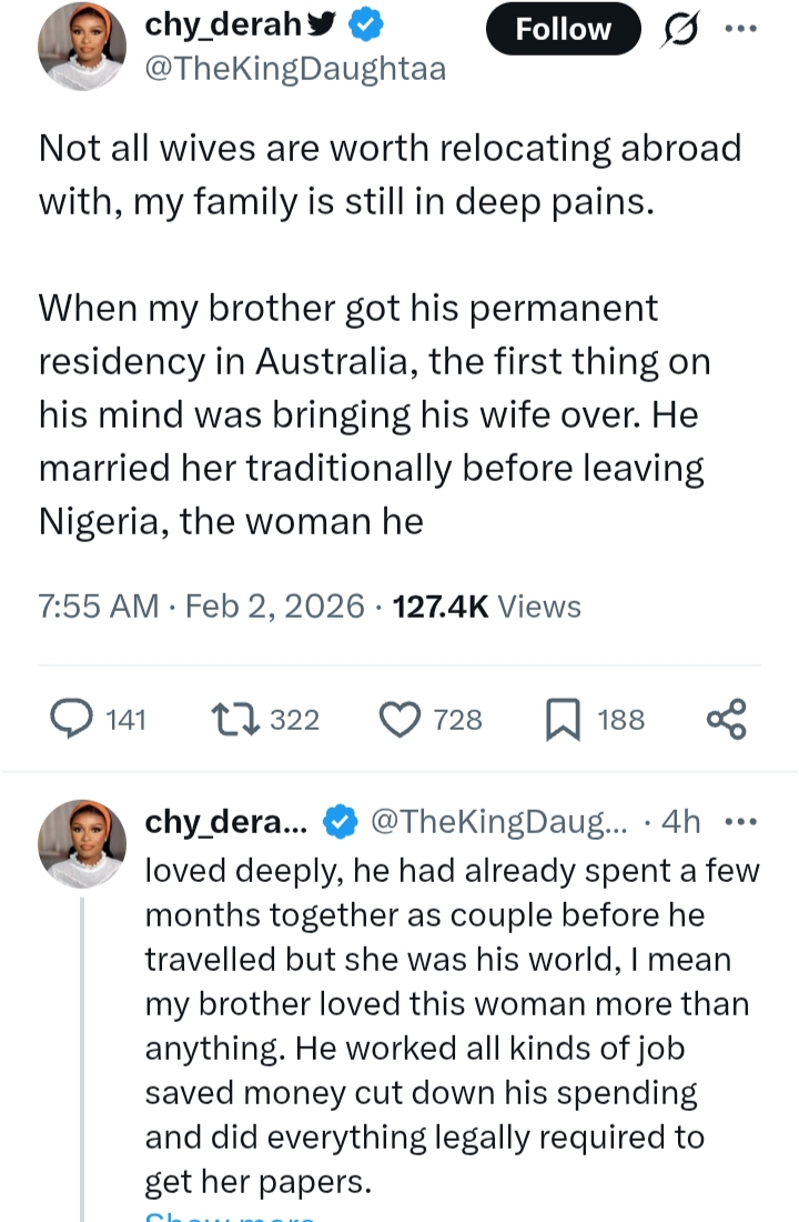 A Nigerian lady identified as @TheKingDaughtaa has shared a heartbreaking account on social media, cautioning that not all spouses are worth relocating abroad with, following a deeply painful experience involving her brother.