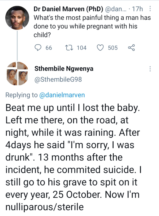 “Beat me up until I lost the baby. Left me there, on the road, at night, while it was raining. After 4days he said “I’m sorry, I was drunk”. 13 months after the incident, he commited suicide. I still go to his grave to spit on it every year, 25 October. Now I’m nulliparous/sterile”