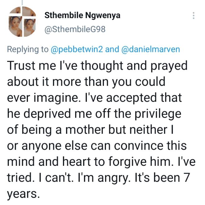 Trust me I’ve thought and prayed about it more than you could ever imagine. I’ve accepted that he deprived me off the privilege of being a mother but neither I or anyone else can convince this mind and heart to forgive him. I’ve tried. I can’t. I’m angry. It’s been 7 years.”